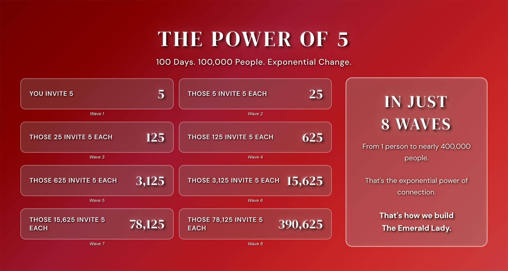 In just 8 waves, one person becomes 390,625 people.